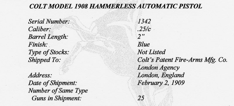 Colt Model 1908 Vest Pocket .25 ACP serial number 89853. Shipped in a 100 gun shipment on April 22, 1913 to Colt's Patent Firearms Company, London Agency, London, England.