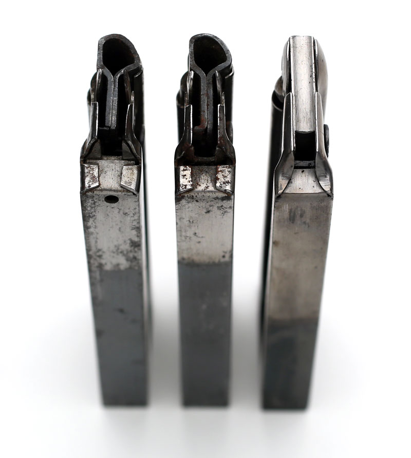 Top view of Ace and Service Model Ace two-tone magazines to show variation in magazine followers.