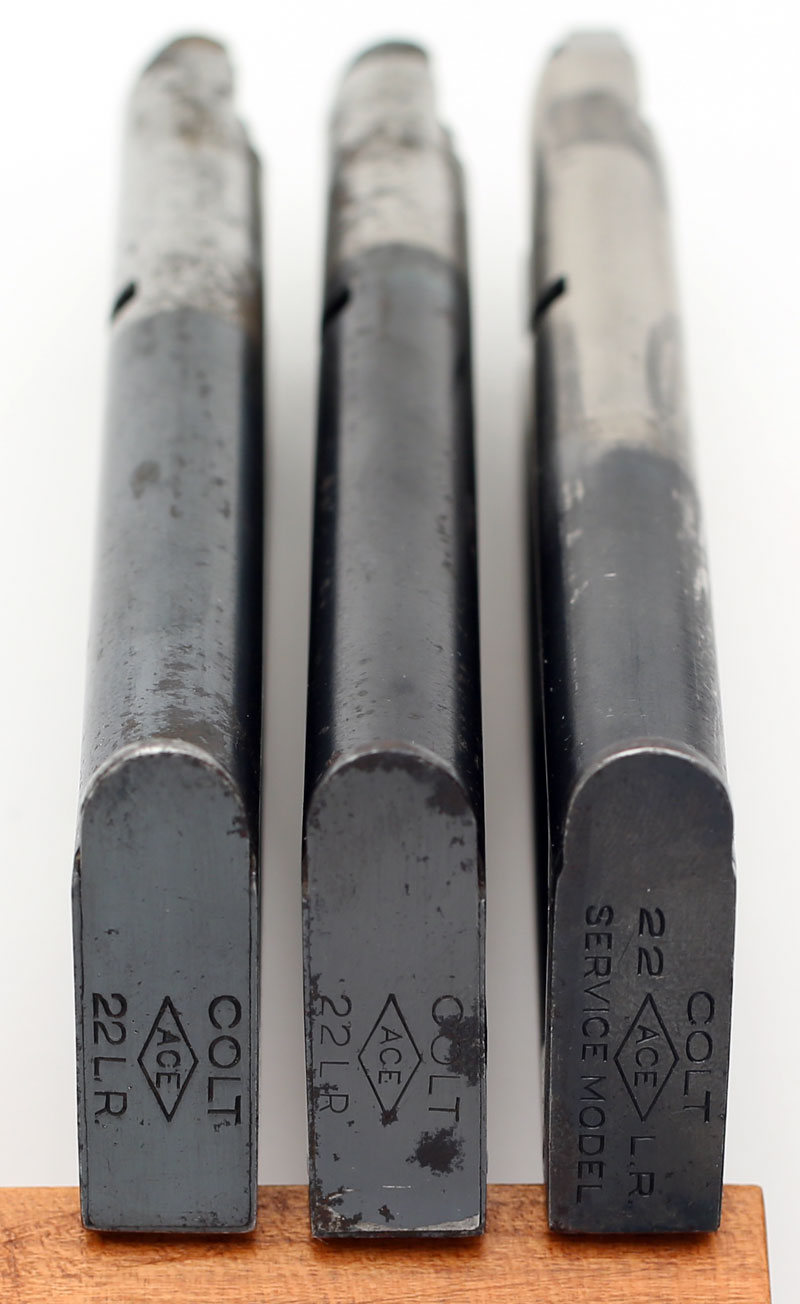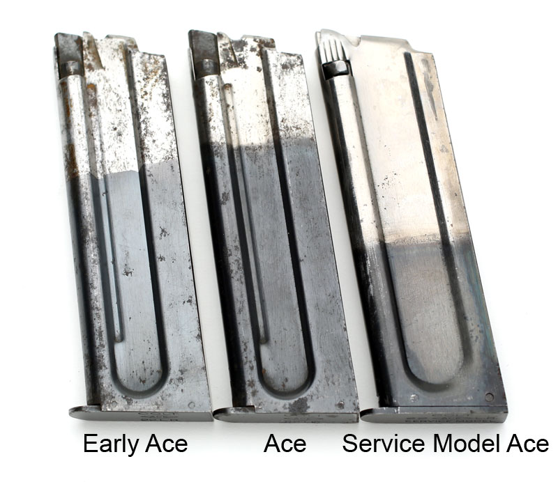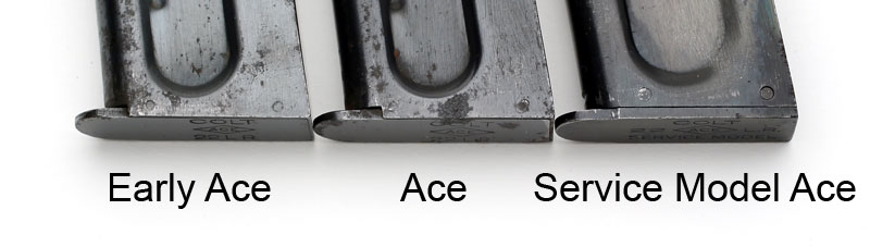 • Earliest type of two-tone Service Model Ace magazine is marked Ace on the base plate (as on the solid breech Ace model).  This was eventually changes to "ACE" over "SERVICE MODEL" (pictured below)