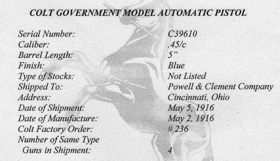 Colt Government Model 1911 serial number C39610 - A 1916 Government Model like new in original box with paperwork, factory test target and cleaning brush.  This pistol was shipped to Powell & Clement Company, Cincinnati, Ohio on May 5, 1916 in a 4 gun shipment.