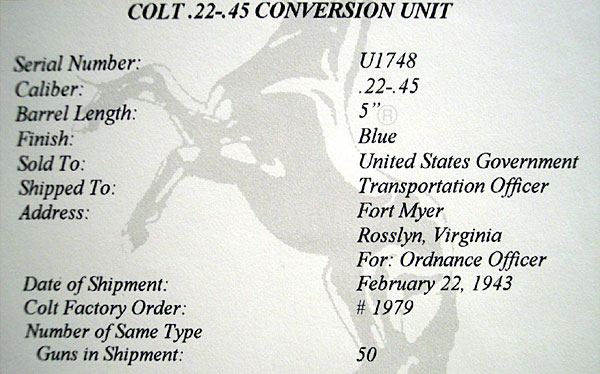 This unit was shipped February 22, 1943 to the United States Government, Transportation Officer, Fort Myer, Rosslyn, Virginia for Ordnance Officer.  Unit was one of 50 in the shipment and was process on Colt Factory Order number 1979.