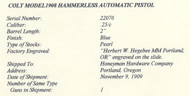 Hegele’s wife was the first Kellogg Cereal Girl (appearing on Kellogg's first cereal boxes as a picture of good health and beauty), born in Battle Creek, MI on March 26, 1889.  In 1908, she and Dr. Hegele were married and he found her a job through his friend down at the Union Pacific Railroad Depot.  The next year Dr. Hegele ordered from Colt this factory inscribed pearl handled .25 caliber pistol for his wife who, for 16 years, worked at the Union Pacific Railroad Depot and had to traverse “Man Town” along the tracks to catch her ride to and from work each day.  Dr. Hegele was the personal physician to the President of the Union Pacific Railroad during this period and a prominent local businessman.  He was also a practicing attorney and a deputy sheriff for Multnomah County, Portland, Oregon.