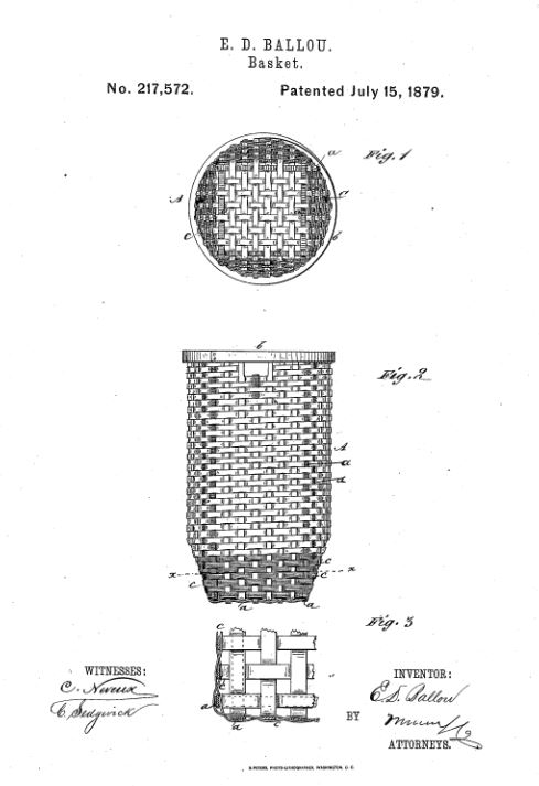 Elmer Davis Ballou - filed for and was awarded US Patent 217,572 for a Basket patented on July 15, 1879.
