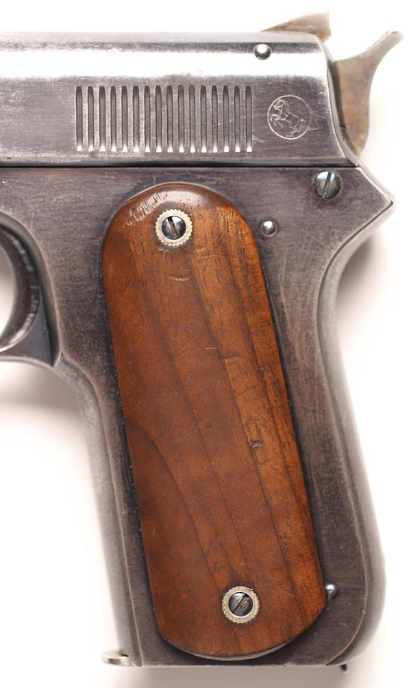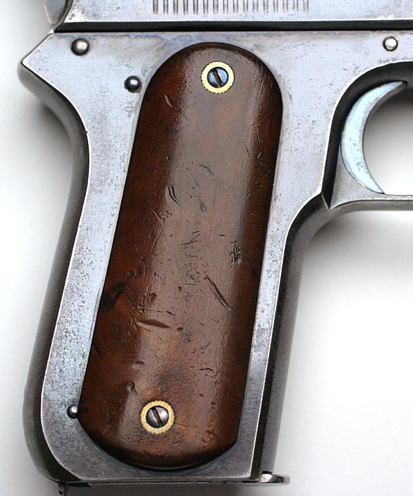 Left grip profile - early Model 1900 pistols were fitted with smooth walnut grips.  Grip screws, hammer screw, pins, trigger, slide lock, magazine release and forward frame plug had a turquoise blued finish.