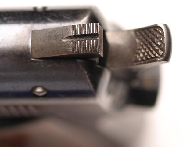 Sight Safety - locked in upward position, this functions as the rear sight.  The sight safety and hammer were color case hardened.