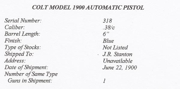 Colt Factory Letter indicates that pistol was shipped June 22, 1900 as a single gun shipment to J.R. Stanton, address unavailable.