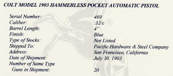 Colt Model 1903 Pocket Hammerless .32 ACP serial number 469 - Factory letter indicates that this pistol was shipped to Pacific Hardware & Steel Company, San Francisco, California on July 30, 1903 in a 20 gun shipment.  Pistol has all of the earliest features found on this model.