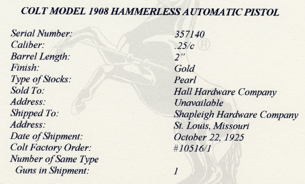 Factory letter confirms these features and indicates that this gun was sold to Hall Hardware Company (address unavailable) and was shipped to Shapleigh Hardware Company, St. Louis, Missouri on October 22, 1925.  It was processed on Colt Factory Order number 10516/1.