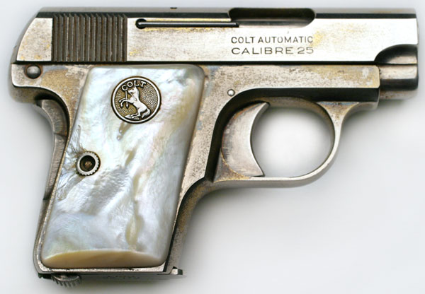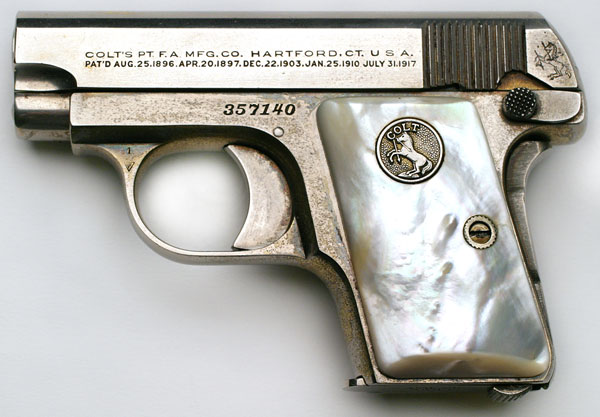 Colt 1908 Vest Pocket .25 ACP serial number 357140 - pistol is factory gold plated and has factory mother of pearl grips with gold plated flush medallions.  The gold plating was rather delicate and is very thin on this example as gold finish remains mostly in protected areas.