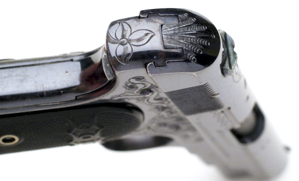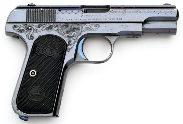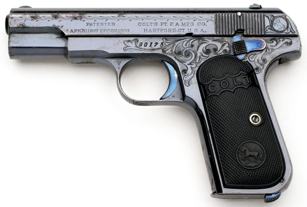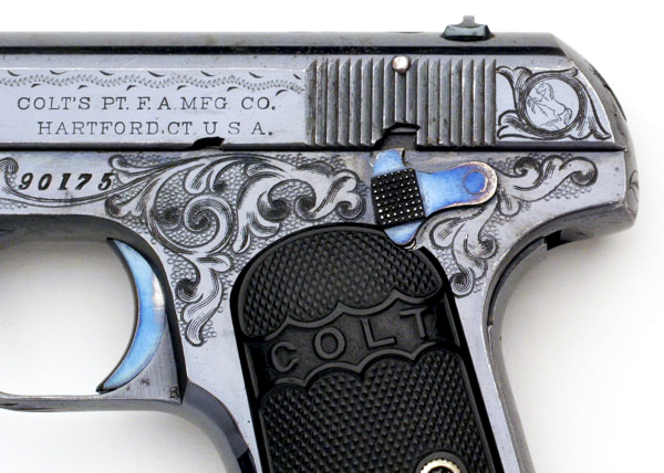 Factory "A" Engraved Colt Model M .32 ACP - serial number 90175.  Pistol was shipped blued, factory engraved with hard rubber grips.  An unusual example as it contains all early Type III features even though it's in the Type II serial number range (approx. 72,000 - 105,000).  Pistols in this range typically have a 3 3/4" barrel with separate barrel bushing.