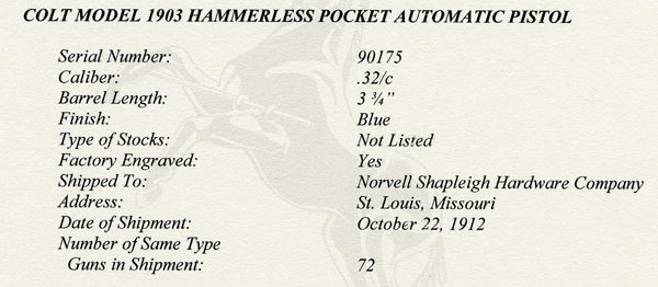 This pistol was one of 72 shipped October 22, 1912 to Norvell Shapleigh Hardware Company, St. Louis, Missouri.