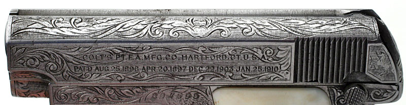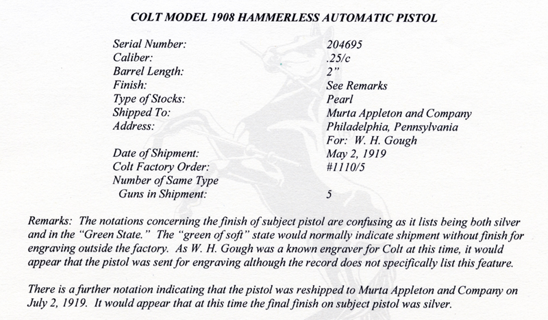 Colt Model 1908 Vest Pocket Model Serial Number 204695 - One of five guns shipped to Murta Appleton, Philadelphia, PA for William H. Gough on May 21, 1919, returned to Colt and reshipped to Murta Appleton on July 2, 1919.  The other four pistols were also silver plated and fitted with mother of pearl grips (See January 2003 Gun of the Month for another example from this five gun shipment.)  This pistol has full factory "C" coverage, is silver plated and is fitted with mother of pearl grips with recessed medallions.  The work was processed on Colt factory order number 1110/5.