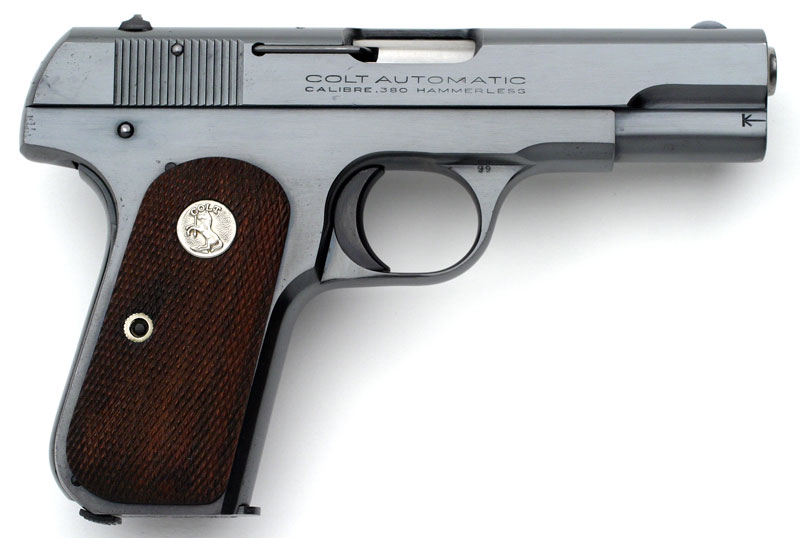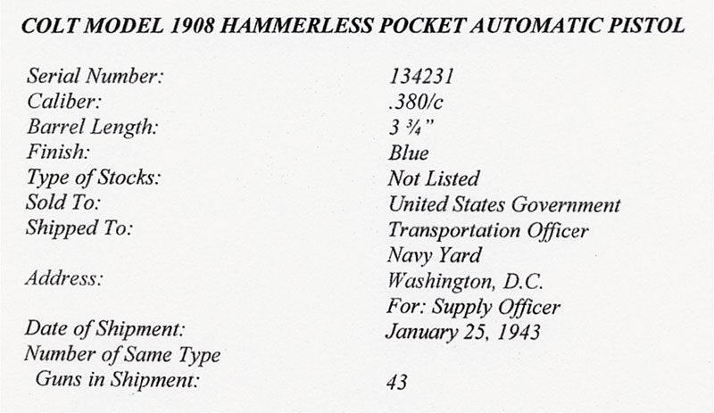 Colt Navy Contract Model 1908 Pocket Hammerless pistol serial number 134231 in .380 caliber - This blued .380 is one of the first 105 Blanket Procured Model M pistols procured between 3/2/42 and 1/25/43.  This pistol was among 55 in the serial number range 133249 - 135019 that were shipped to the Washington Navy Yard.  Specifically, it was one of 43 guns shipped January 25, 1943 to the United States Government, Transportation Officer, Navy Yard, Washington, DC for Supply Officer.