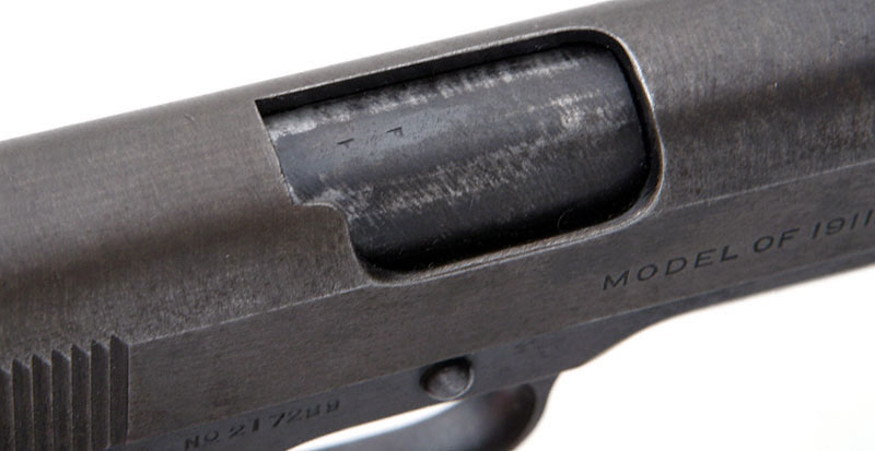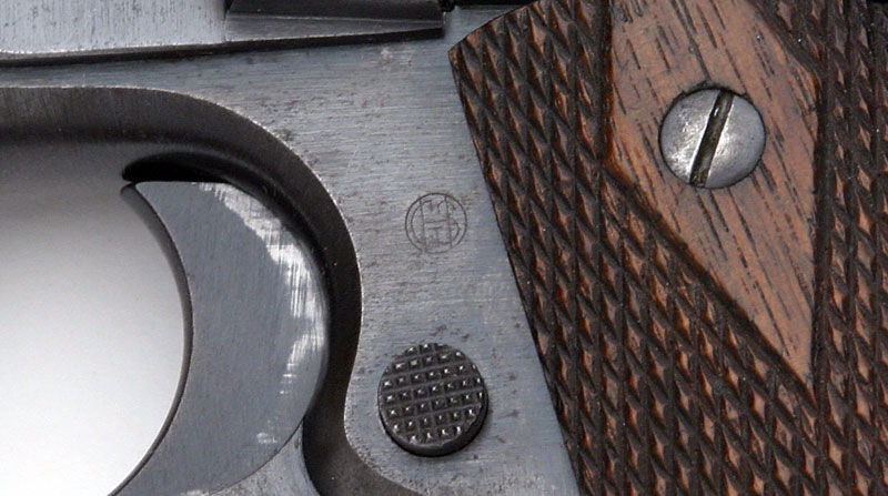 Left side.  The mark of Army Inspector of Ordnance Major Gilbert H. Stewart. Stewart inspected these pistols from September 30, 1914 - January 12, 1918. Serial numbers of Model 1911 pistols inspected 101500 - 230000.