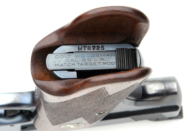 The first series Woodsman Match Target magazine has a three line inscription "Colt Woodsman" over "CAL. 22 L.R." over "Match Target Mod."