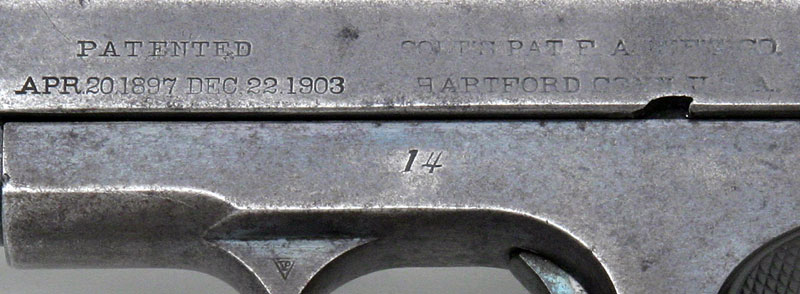 Colt Model 1908 Pocket Hammerless .380 ACP serial number 14 - Close-up of left side slide markings and serial number.