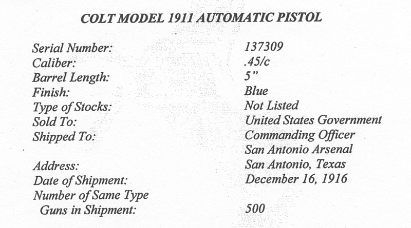 Colt Model of 1911 U.S. Army .45 ACP serial number 137309 (ca. 1916) - This Colt 1911 was one of 500 pistols (136901 - 137400) shipped to San Antonio Arsenal, San Antonio, Texas on December 16, 1916. Accompanying M1912 holster is marked "STATE OF TEXAS" on the flap and on the swivel. Also accompanying this pistol is a pair of Type I lanyard loop magazines.