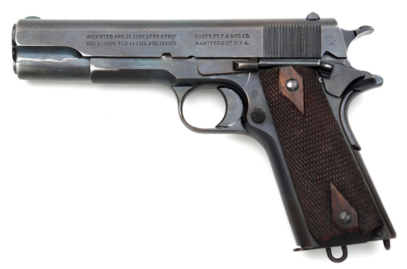 Colt Model of 1911 serial number 137309 (right side) pictured with two Type I magazines.