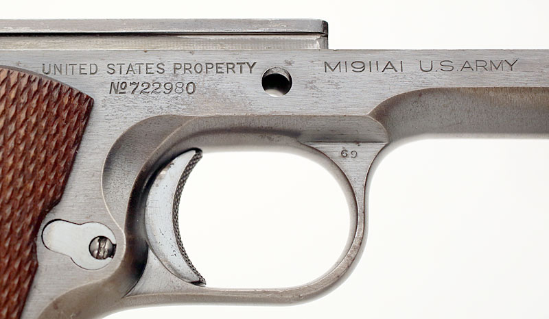 Colt Model 1911A1 .45 ACP serial number 722980 (ca. 1941) - Close-up of right side of frame showign UNITED STATES PROPERTY marking, serial number andM1911A1 U.S. ARMY roll mark.