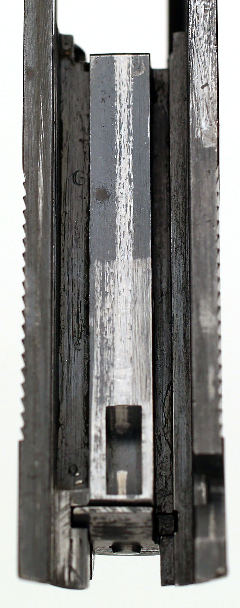 Colt Model 1911A1 .45 ACP serial number 722980 (ca. 1941) - Small G in front of barrel lug.
