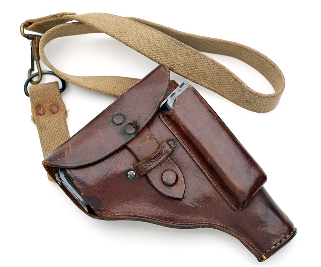 Colt 1903 Pocket Hammerless .32 ACP serial number 318150 - One of 36 pistols shipped to Jardine Matheson Company, Shanghai, China on November 14, 1919.  Pistol has a blue finish and Colt hard rubber stocks.  Accompanying this pistol is brown leather British flap holster that's been converted from a hip holster to a shoulder holster.