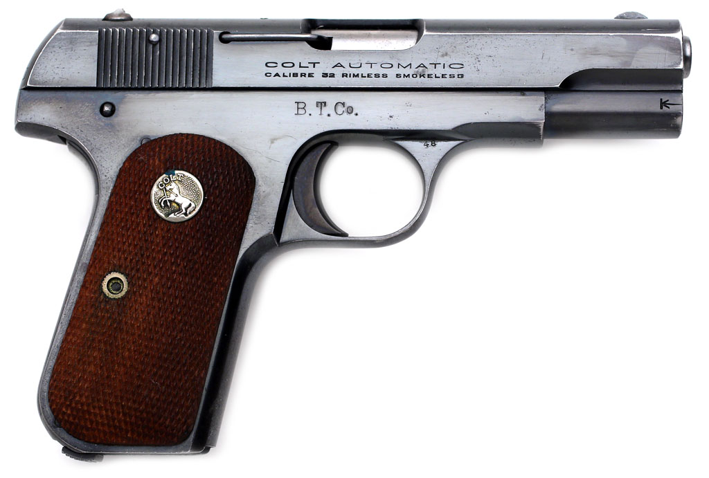 Colt 1903 Pocket Hammerless .32 ACP serial number 476915 - High condition Type IV manufactured ca. 1927. This pistol has "B.T.Co." inscribed on the right side of the frame and the inscription in under the original blue finish. Correct checkered walnut stocks with late style flush medallions. While this example is a no letter gun, other documented examples with this mark are Colt 1903 .32 ACP serial number 494188 (ca. 1929), serial number 514147 (ca. 1932) and serial number 514269 (ca. 1933). All attributed to Bankers Trust, Hartford, Connecticut.