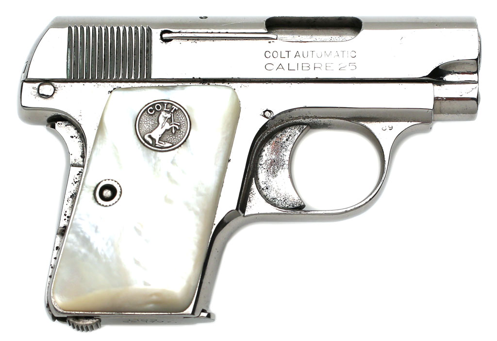 Colt 1908 Vest Pocket .25 ACP serial number 340461 - Pistol has old nickel plated refinish and factory mother of pearl stocks with early flush forward facing Colt medallions. The forward facing flush medallions were only used for a few months during production. Colt later made the decision to use the same flush medallion in both stocks, presumably to save money. Pistol letters nickel with mother of pearl stocks and was shipped to Hibbard, Spencer, Bartlett & Company on December 26, 1923 in a 2 gun shipment. Work was processed on Colt factory order #8079/12.