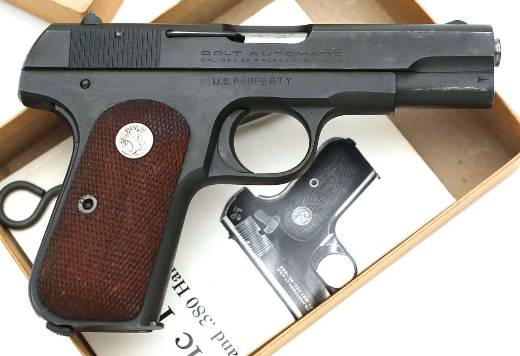 Colt Model 1903 Pocket Hammerless .32 ACP serial number 571146 - parkerized finish, checkered walnut stocks, factory roll marked "U.S. PROPERTY" on right side of frame above trigger area and ordnance inspected on left side of frame behind the thumb safety (light stamp). Box, instructions and cleaning rod are aftermarket reproductions added by a previous owner.