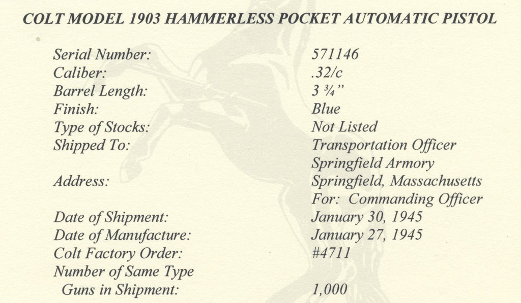 Colt Model 1903 Pocket Hammerless .32 ACP serial number 571146 - Factory letter indicates this pistol was one of 1,000 shipped January 30, 1945 to the Transportation Officer, Springfield Armory, Springfield, Massachusetts for: Commanding Officer.  It was manufactured on January 27, 1945 and processed on Colt Factory Order Number 4711.  Most letters for these late military 1903 Pocket Hammerless pistols incorrectly indicate the finish as "blue" as in the case of this pistol as the change from blue to parkerized finish occurred at the Colt factory in the 561,000 serial number range.
