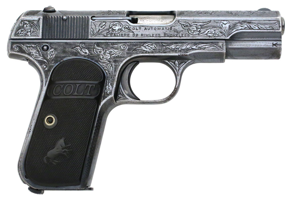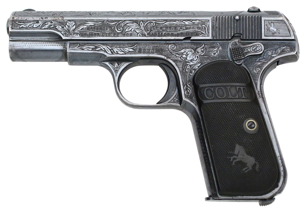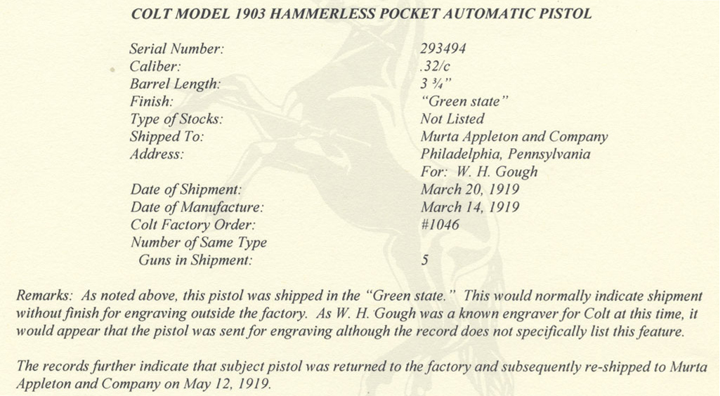 Colt 1903 Pocket Hammerless .32 ACP factory master engraved - Factory letter indicates that this pistol was manufactured on March 14, 1919 and shipped on Colt Factory Order # 1046 in the "Green State" for engraving to Murta Appleton and Company, Philadelphia, Pennsylvania for W.H. Gough in a 5 gun shipment.  The letter further notes that William H. Gough was a known engraver for Colt at the time.  The letter further indicates that this pistol was returned to the factory and subsequently re-shipped to Murta Appleton and Company on May 12, 1919.