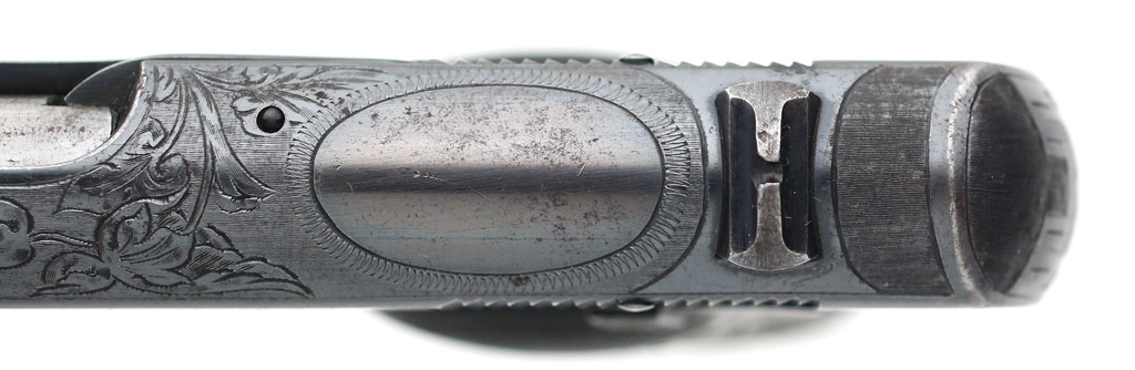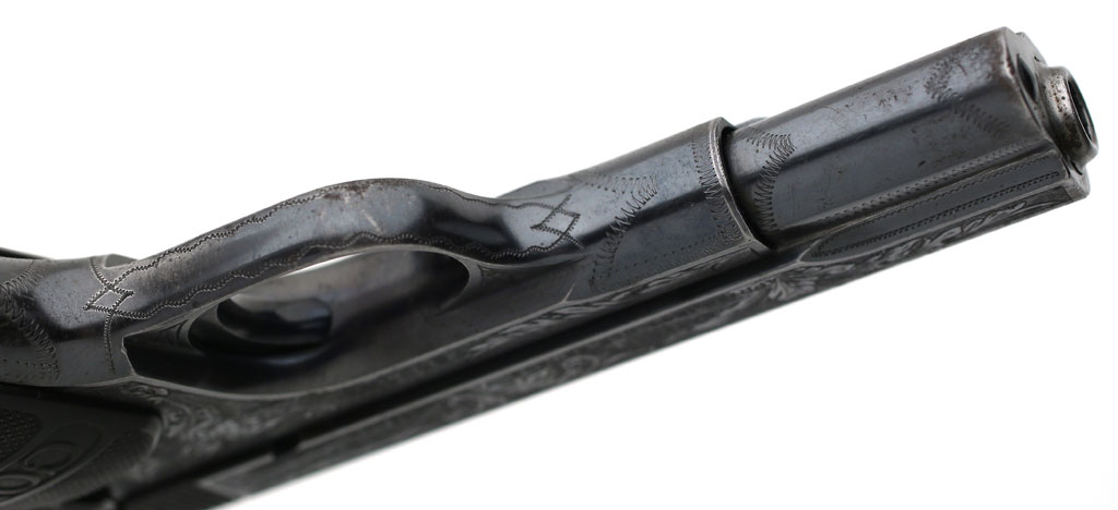 Colt Model 1903 Pocket Hammerless .32 ACP factory master engraved - serial number 293494, factory master engraved by William H. Gough. Close-up of rear top of slide.