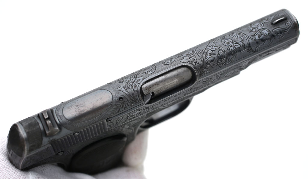 Colt Model 1903 Pocket Hammerless .32 ACP factory master engraved - (top of slide) serial number 293494, factory master engraved by William H. Gough. Engraved with Gough's floral and vine design of engraving and fine lined background.