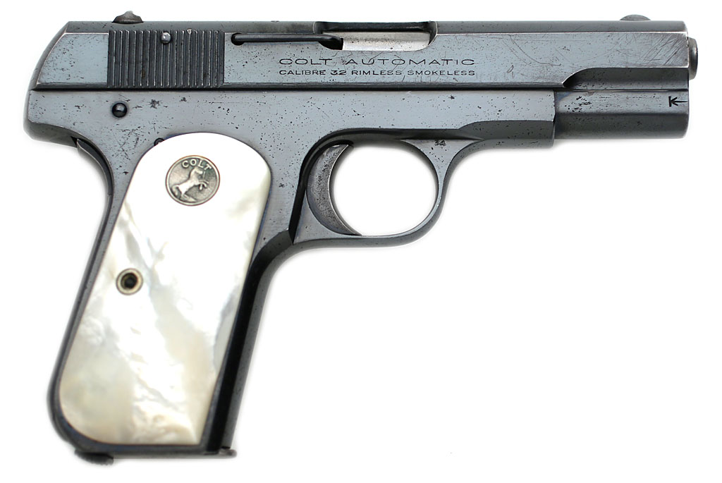 Colt Model 1903 Pocket Hammerless .32 ACP serial number 447017 - Blue finish with factory mother of pearl stocks with forward facing flush medallions.
