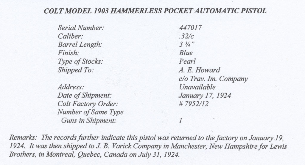 Colt Model 1903 Pocket Hammerless .32 ACP serial number 447017 - Factory letter indicates that this pistol was shipped to A.E. Howard c/o Trav. Im. Company, January 17, 1924 and processed on Colt Factory Order Number 7952/12 in a single gun shipment.  The records further indicate this pistol was returned to the factory on January 19, 1924 and then shipped to J.B. Varick Company in Manchester, New Hampshire for Lewis Brothers, in Montreal, Quebec, Canada on July 31, 1924.