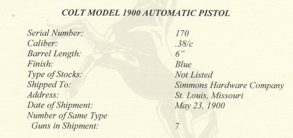Colt Model 1900 Sight Safety Serial Number 170 - This Colt 1900 pistol was one of seven guns shipped May 23, 1900 to Simmons Hardware Company, St. Louis, Missouri.