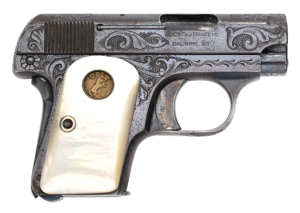 Colt 1908 Vest Pocket .25 ACP serial number 83713 - Pistol is factory engraved ("1 1/4" by Helfricht), has original blue finish and factory recessed medallion round-top mother of pearl stocks. Factory letter confirms this pistol was factory engraved and shipped with mother of pearl stocks to Shelton Payne Arms Co. on February 22, 1913 in a two gun shipment.