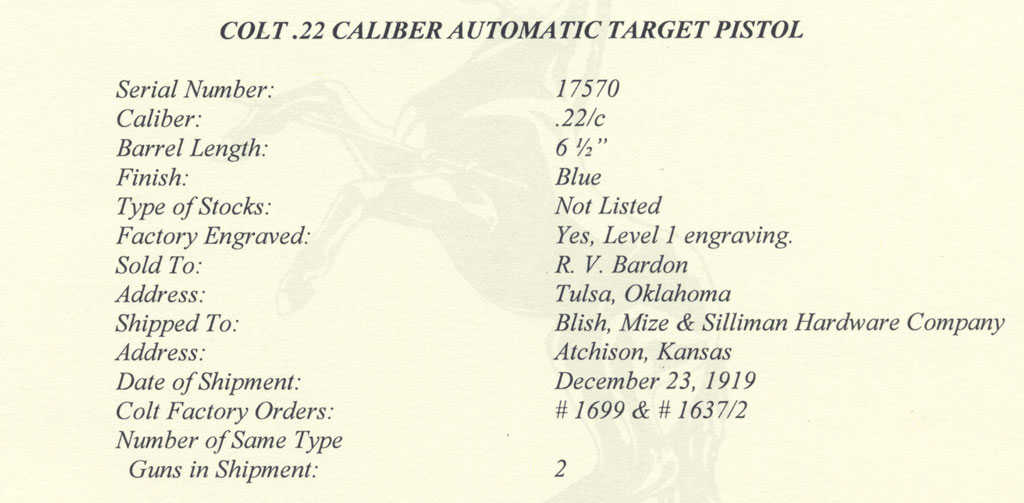 Colt Automatic Target Pistol .22 LR Serial Number 17570 - An early Model S "Pre-Woodsman" factory engraved and silver inlaid by Colt Master Engraver William H. Gough.  This pistol was shipped on December 23, 1919 to Blish, Mize, Silliman Hardware Company in Atchison, Kansas and sold to R.V. Bardon in Tulsa, Oklahoma. One of two guns in the shipment. Note the two factory order numbers.