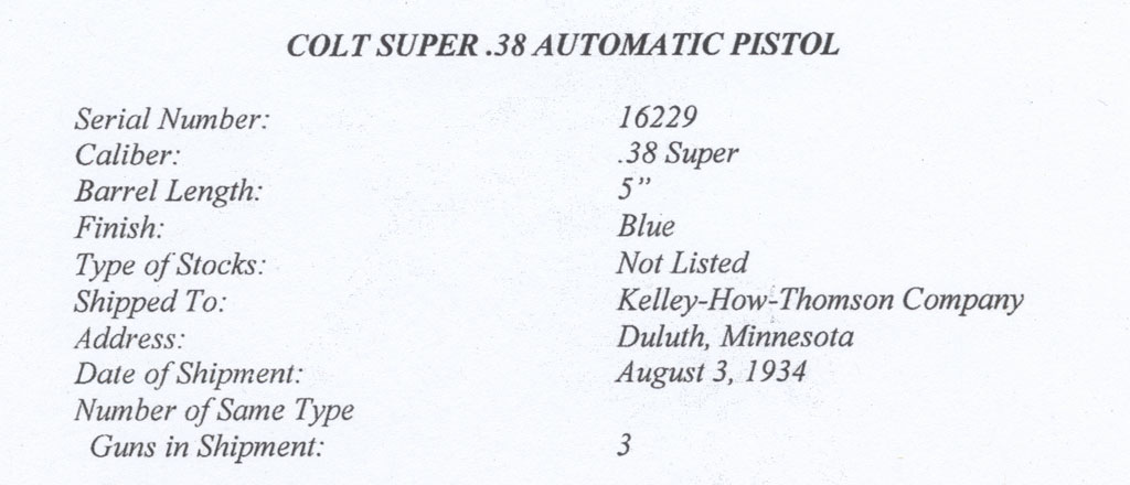 Colt Super .38 serial number 16229 - factory letter confirming configuration and shipment to Kelley-How-Thomson Company, Duluth, Minnesota, August 3, 1934, one of three guns in shipment.