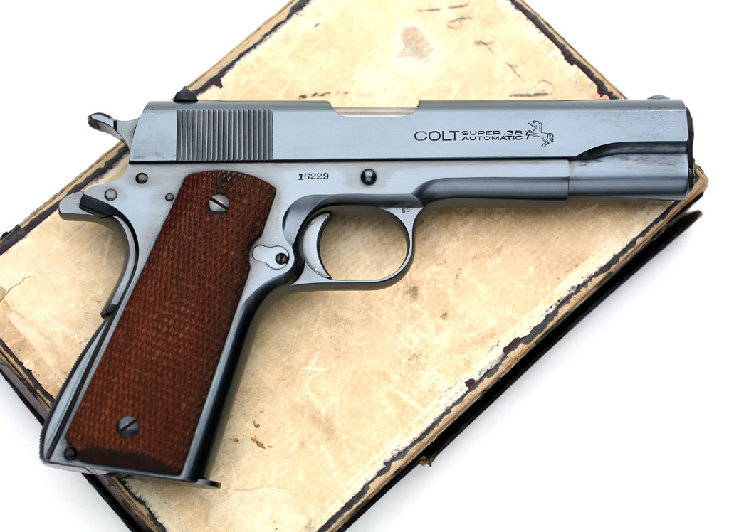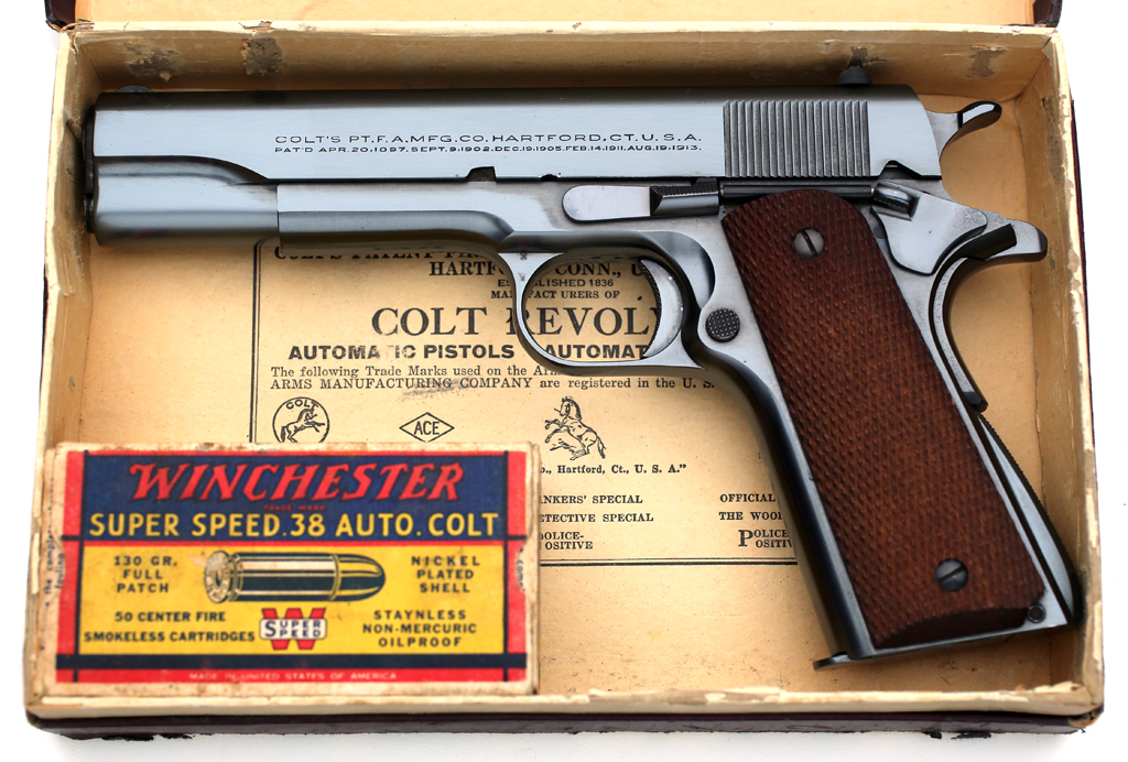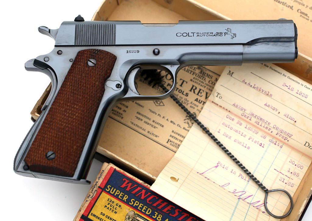 Colt Super .38 serial number 16229 - factory blue finish with checkered walnut stocks with original box (numbered to the gun) sales receipt from 1935 and original cleaning brush.
