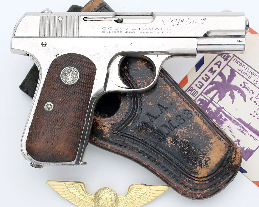 Colt Pocket Hammerless 1908 .380 ACP serial number 100046 (ca. 1928) - Nickel plated Model M .380 with original S.D. Myres holster carried by pilot Russel Arden, an airline pilot in 1930 when he flew for what became American Airlines. He was required to carry a pistol when transporting the mail and also when he was with a civilian pilot for the Air Transport Command during WWII. There are no specific markings on the gun (aside from the owner's own identification number: V713669), however, the leather S.D. Myres holster has an AA stamp (for American Airways), AM33 (which means Airmail Route 33).