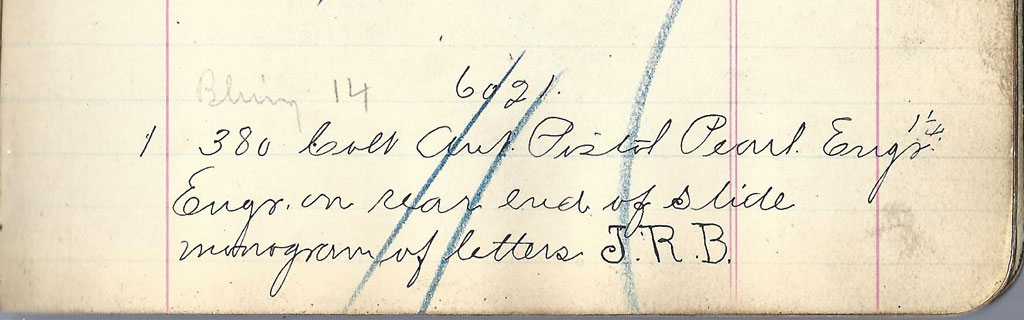 engraved and factory inscribed "JRB" monogram on rear of frame.