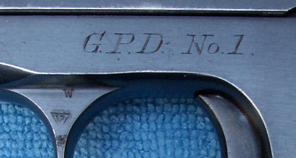 Model M .32 serial number 381490 with factory inscription "G.P.D. No. 2"