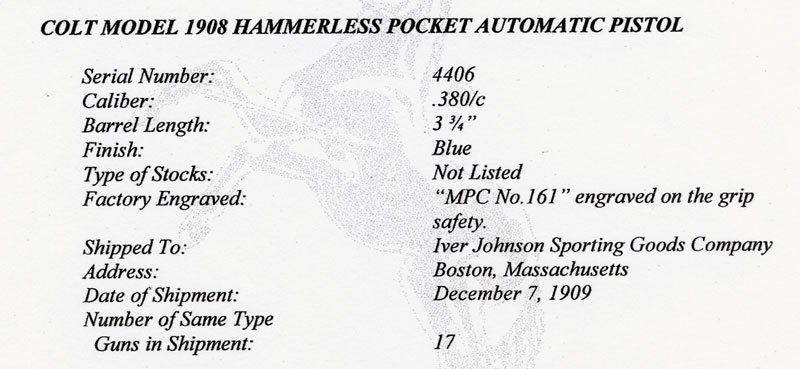 Model M .380 serial number 4406 factory inscribed "M.P.C. No. 161" on grip safety.  An early police marked example with separate barrel bushing and one of 17 shipped on December 7, 1909 to Iver Johnson Sporting Goods Company, Boston, Massachusetts.  This police contract is the earliest contract on record at Colt for the .380 caliber Model M pistols. MPC is believed to be the Metropolitan Parks Commission (Boston PD).  There were a total of 214 pistols sn 1328 - 14644 shipped 12/5/08 - 6/4/13.