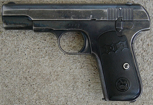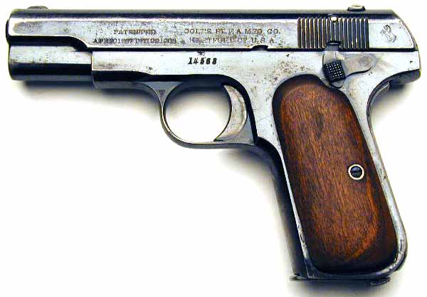 Model M .380 serial number 14568 factory inscribed "M.P.C. No. 194" on grip safety.  One of 15 pistols shipped to William Reed & Sons, Boston, MA on May 28, 1913.  An example from near the end of the contract run with integrated barrel bushing  Grips have been replaced with smooth walnut type.  This police contract is the earliest contract on record at Colt for the .380 caliber Model M pistols. MPC is believed to be the Metropolitan Parks Commission (Boston PD).  There were a total of 214 pistols sn 1328 - 14644 shipped 12/5/08 - 6/4/13.