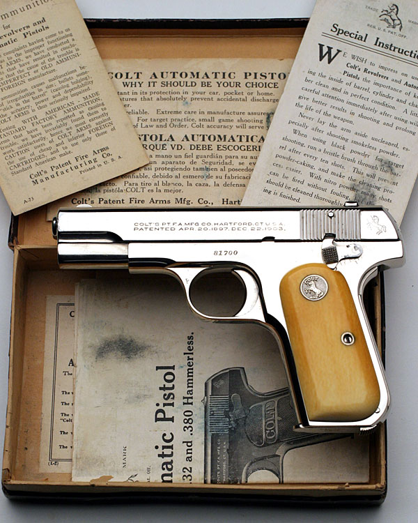 Colt Model 1908 Pocket Hammerless (Model M) .380 ACP Serial number 81700 - Factory letter indicates that this pistol was shipped May 21, 1925 with nickel finish and factory ivory grips as a single gun shipment. It was sold to the Sweet Burnett Drug Company and shipped to Wyeth Hardware & Manufacturing Company, St. Joseph, Missouri. The gun was processed on Colt Factory Order number 9960/1.   Box is numbered to the gun and bears the small "Ivory" label to the left of the "Hammerless" end label.