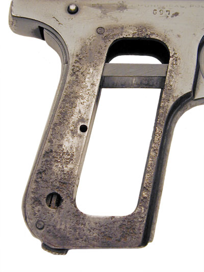 A close-up of the faint but present "SHANGHAI MUNICIPAL POLICE" marking above the right grip.  Also present is the matching SMP number 697, present on the frame (below the SMP marking), on the barrel (visible through the ejection port) and on the slide (in front of the right side slide legend.)