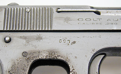 Serial Number 88475, No. 697 - The earliest pistols acquired for the Shanghai Municipal Police were at least 270 in quantity (based on SMP records) with no indication of caliber.  It is presumed that these were obtained from commercial distributors since there are no Colt records of these shipments documenting a contract order prior to the Colt documented contract shipments from 1925 to 1938.