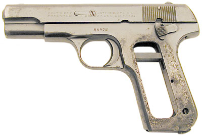 Colt 1908 Pocket Hammerless .380 ACP Serial Number 88986, No. 800 - Virtually all of the SMP marked Colt Model M .380 pistols have been reblued at some point in time.  The harsh climate was very unforgiving to the finish of these pistols.  These guns were shipped with medallion checkered walnut grips and the walnut held the moisture against the frame of the pistol causing extreme pitting under the grips.