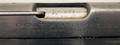In addition to the SMP number 697, this pistol also has an "R" stamped on the barrel.  The significance of this letter is unknown.