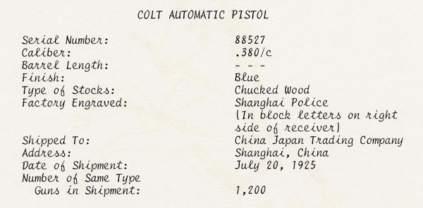 Colt Factory Letter for Colt 1908 Pocket Hammerless .380 ACP shipped to the Shanghai Municipal Police.